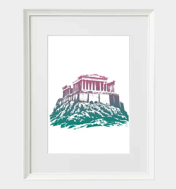 Obraz Akropolu, ręcznie odbijany na prasie drukarskiej, olśniewa bogatymi kolorami i subtelnymi gradientami. Grafika przedstawia majestatyczne ruiny Akropolu w Atenach, z wyraźnymi detalami Partenonu i innych klasycznych budowli. Ręczna technika druku nadaje każdemu egzemplarzowi wyjątkowy charakter, oddając historyczną chwałę tego starożytnego kompleksu.