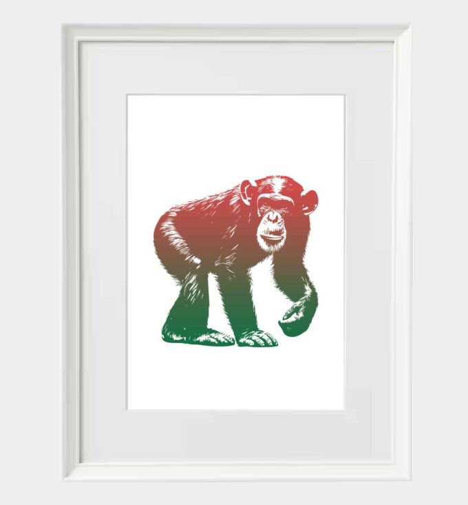 Obraz szympansa, ręcznie odbijany na prasie drukarskiej, olśniewa różnorodnością kolorów i subtelnymi gradientami, które oddają pełną ekspresję tego inteligentnego zwierzęcia. Każda odbitka uchwyca detale, takie jak mimika twarzy i tekstura futra, co nadaje obrazowi unikalny i artystyczny charakter. Taki obraz wnosi do wnętrza element dzikiej przyrody oraz przyciąga uwagę swoją naturalną i żywą prezencją.